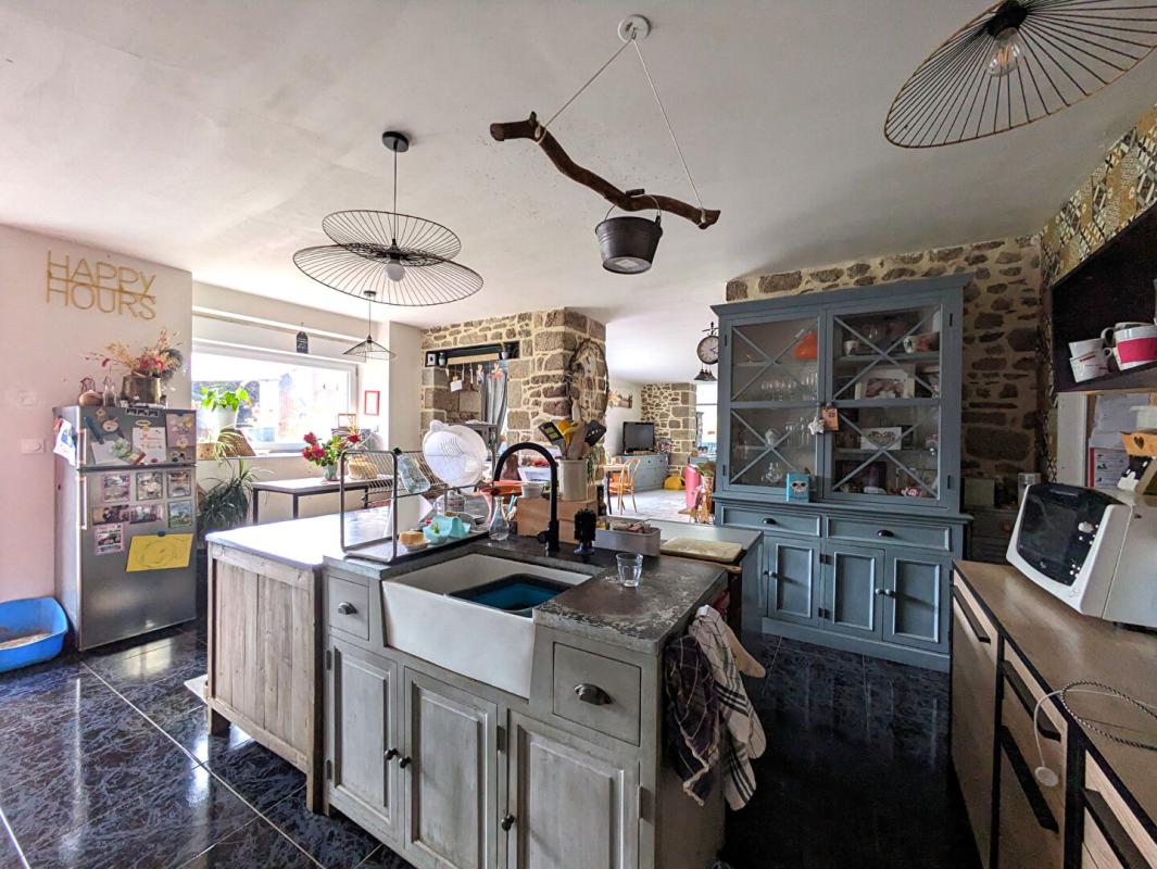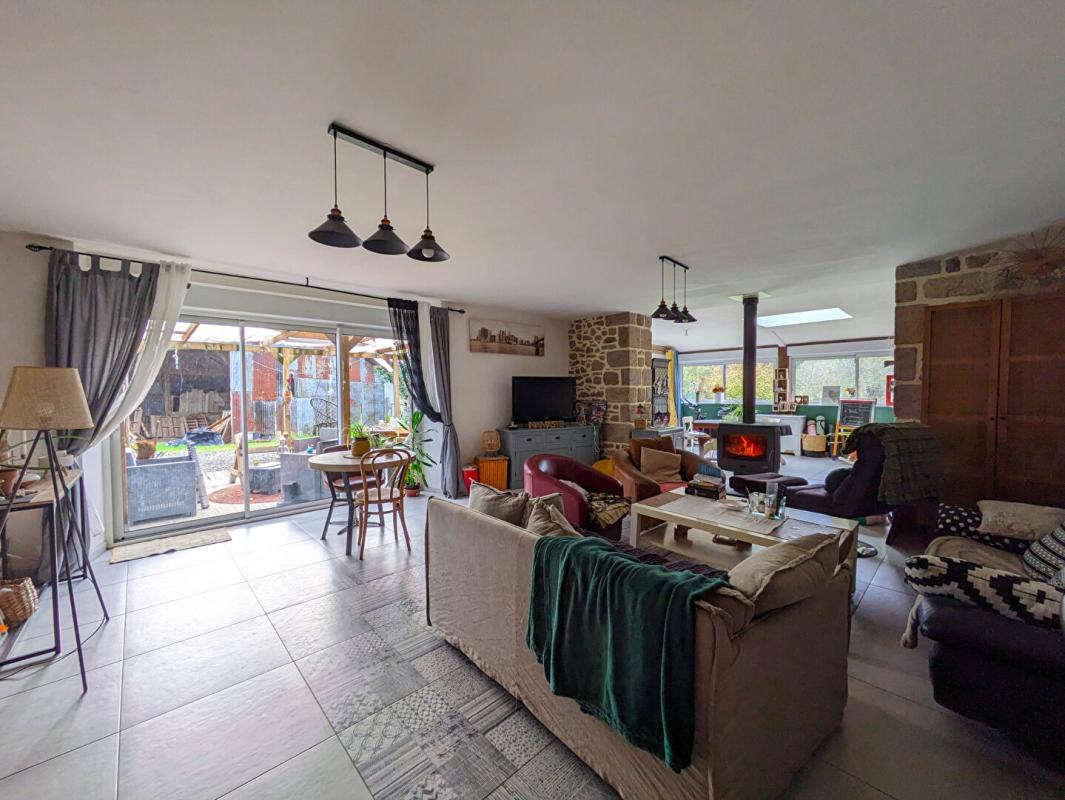 Une maison d’habitation de 173m² composée au RDC d’une cuisine équipée et aménagée ouverte sur un salon séjour et son poêle à bois également ouvert sur une salle à manger.