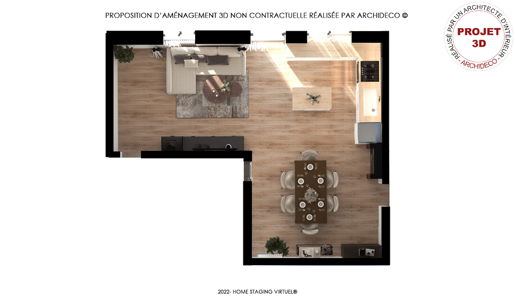 Votre agence vous présente un projet ARCHIDECO – HOME STAGING VIRTUEL® réalisé par un architecte d’intérieur (proposition d’aménagement 3D non contractuelle). Contactez-nous pour plus d’informations.