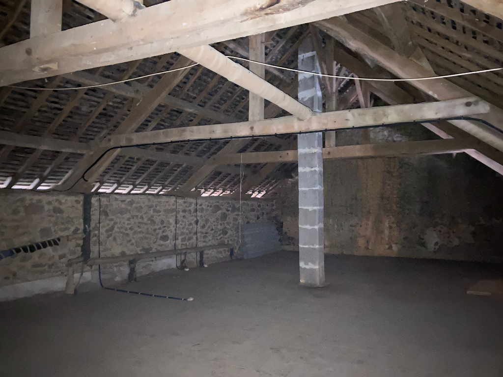 Elle est orientée au sud. C’est une maison mitoyenne de 2 étages construite en pierres. Elle propose une pièce à vivre de 24 m² avec cheminée insert, trois chambres (entre 10 et 12 m²) . Elle est aussi composée d’une salle d’eau, de toilettes et d’un cellier. Elle dispose aussi d’un grenier aménageable (de 60 m² environ) et d’un garage. Puits.