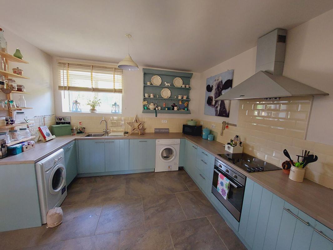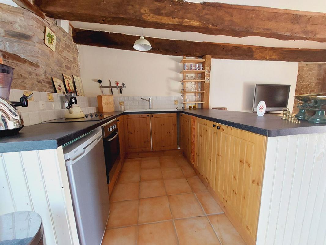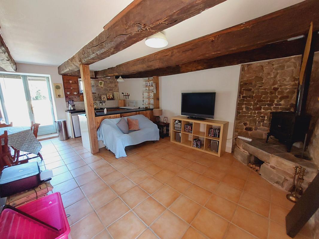 La maison principale est composée d’un vaste séjour lumineux avec poêle à bois ouvert sur une grande cuisine aménagée et équipée, un WC indépendant et une buanderie.