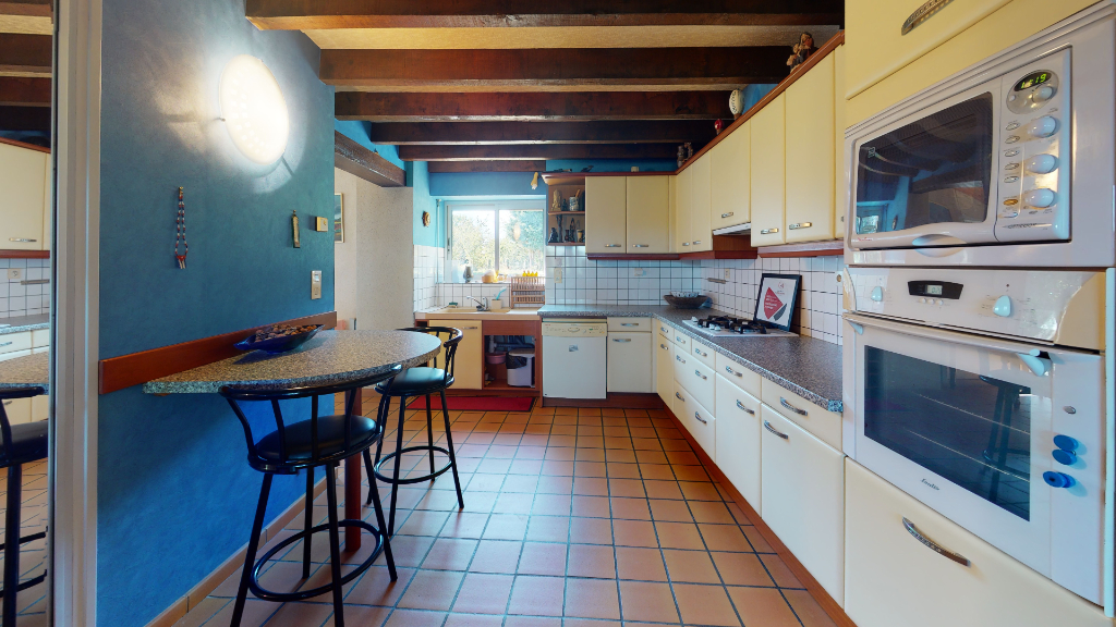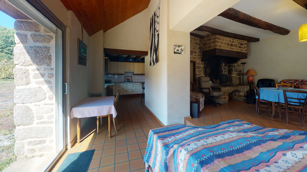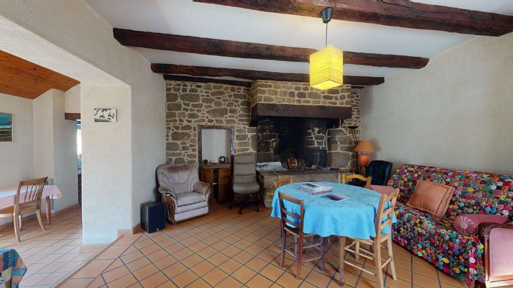 Maison de type longère, indépendante, comprenant au RDC : séjour-salon avec cheminée, coin repas, cuisine ouverte aménagée et équipée, WC.