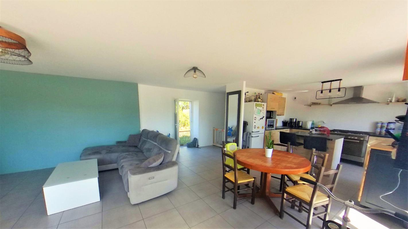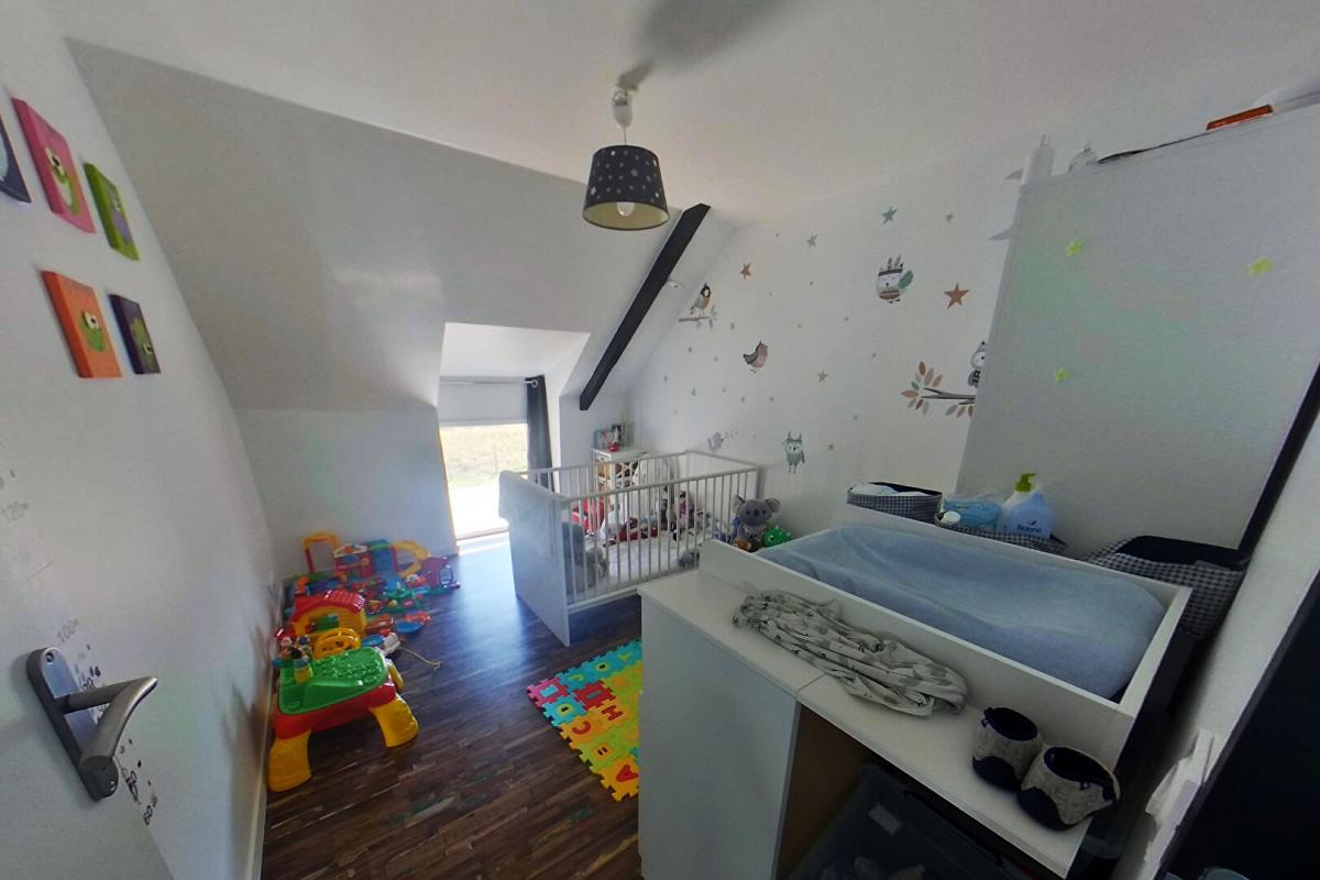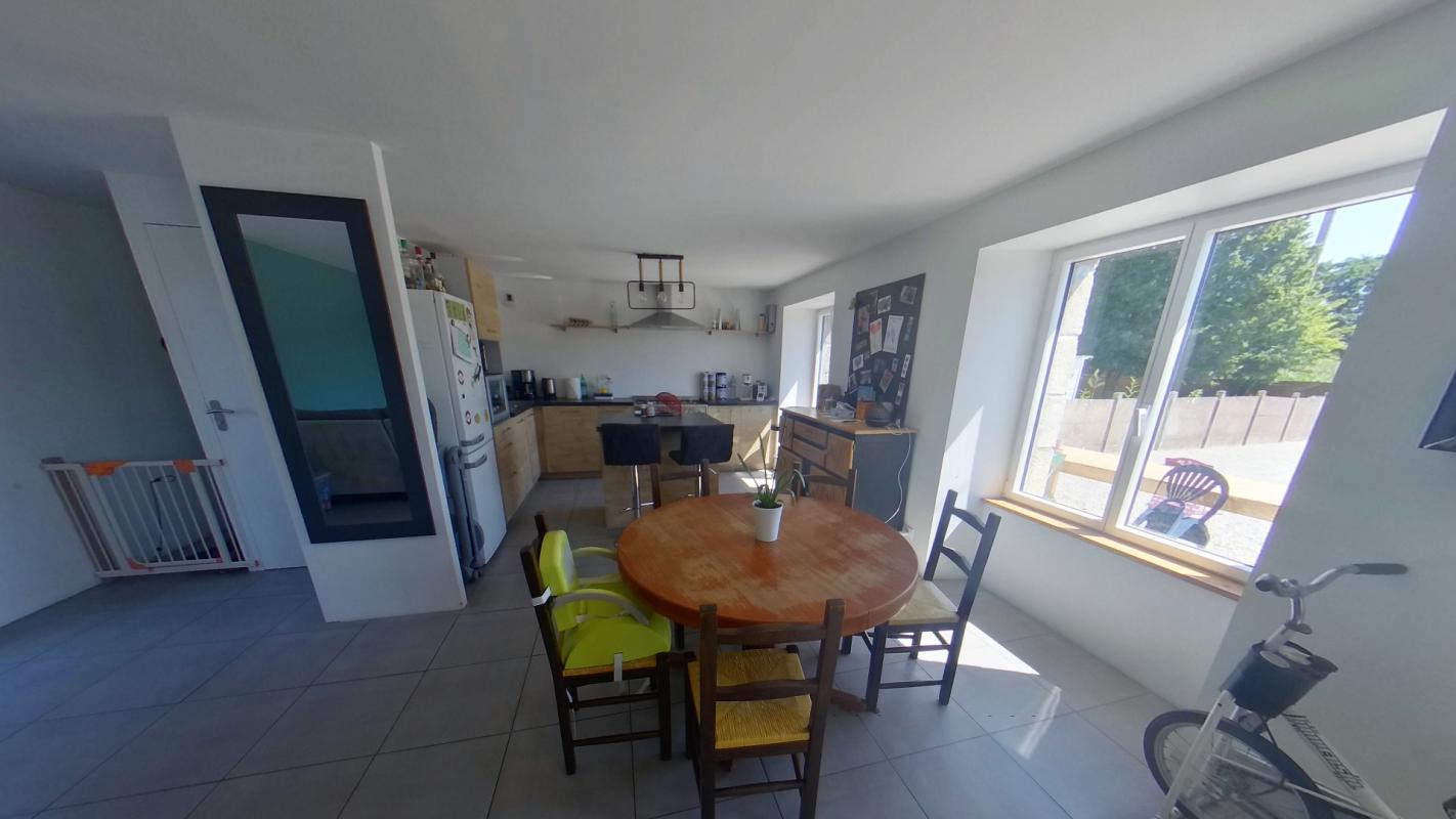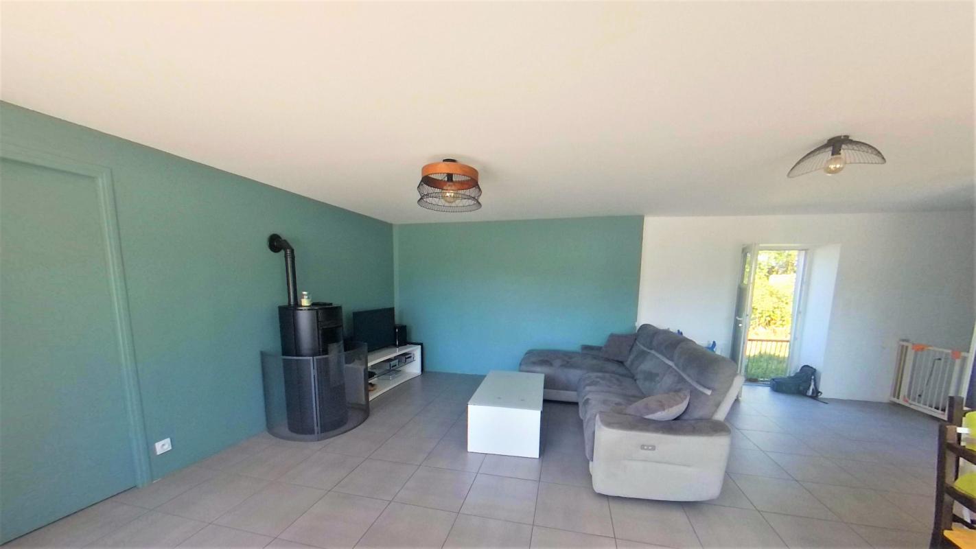 Le RDC : une cuisine ouverte équipée, salon-séjour exposé plein sud, d’un cellier et d’un WC indépendant. Chauffage au poêle à granulés.