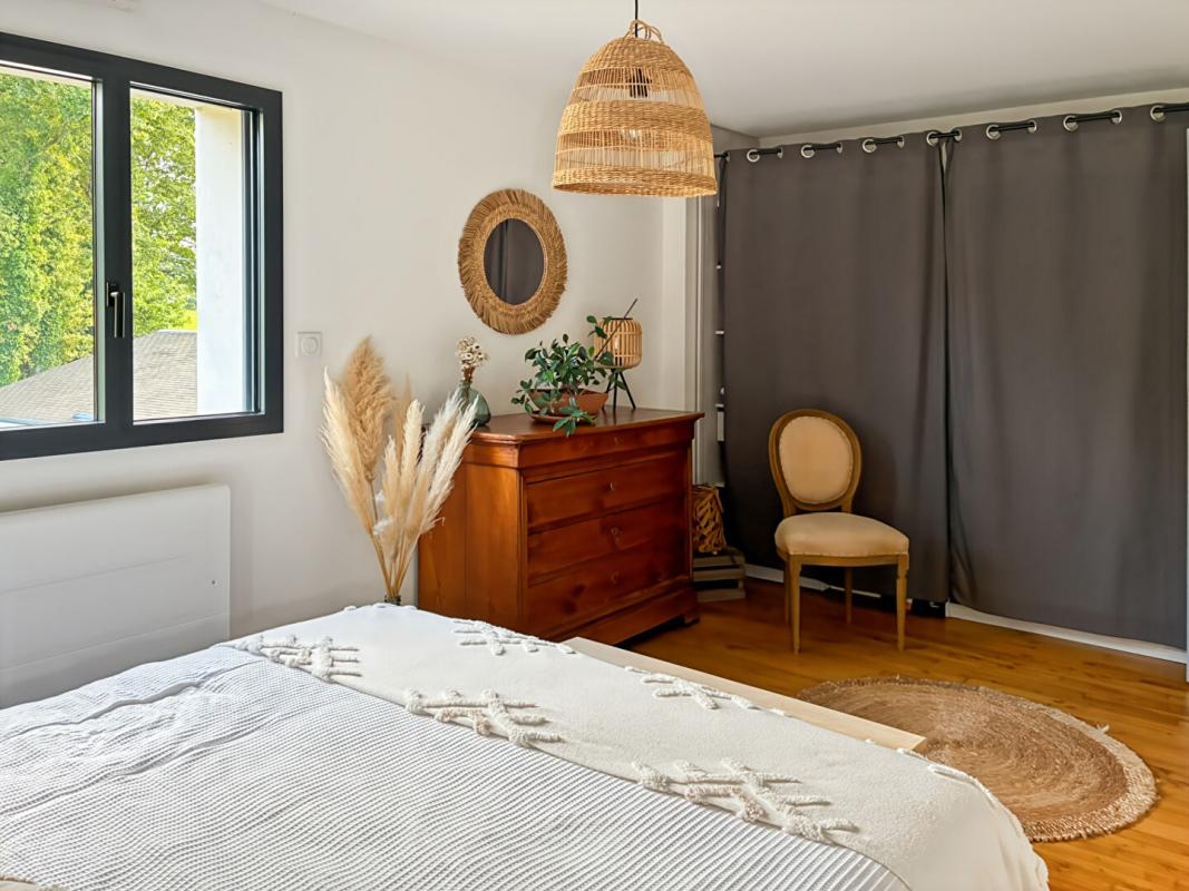 Au rez-de-chaussée : vaste pièce de vie de 45 m² avec poêle à granulés, cuisine ouverte aménagée , buanderie, WC, et une suite parentale avec dressing et salle d’eau/WC.