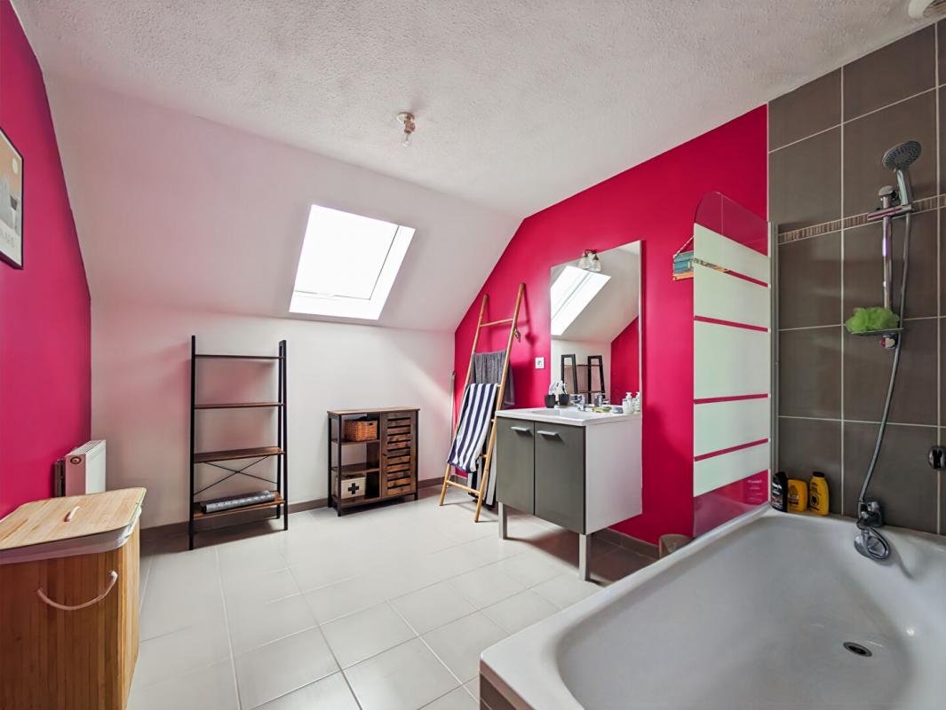 A l’étage : un palier desservant 3 chambres lumineuses et bien proportionnées dont 2 avec placard, une salle de bain et un wc séparé.