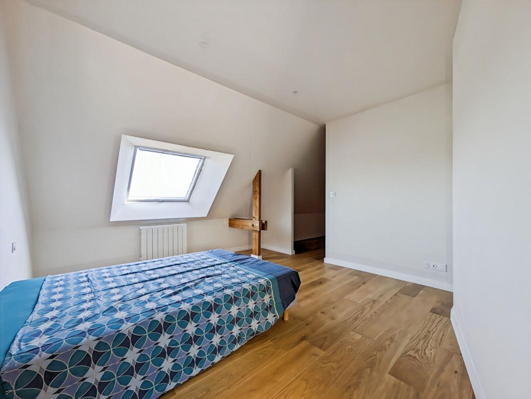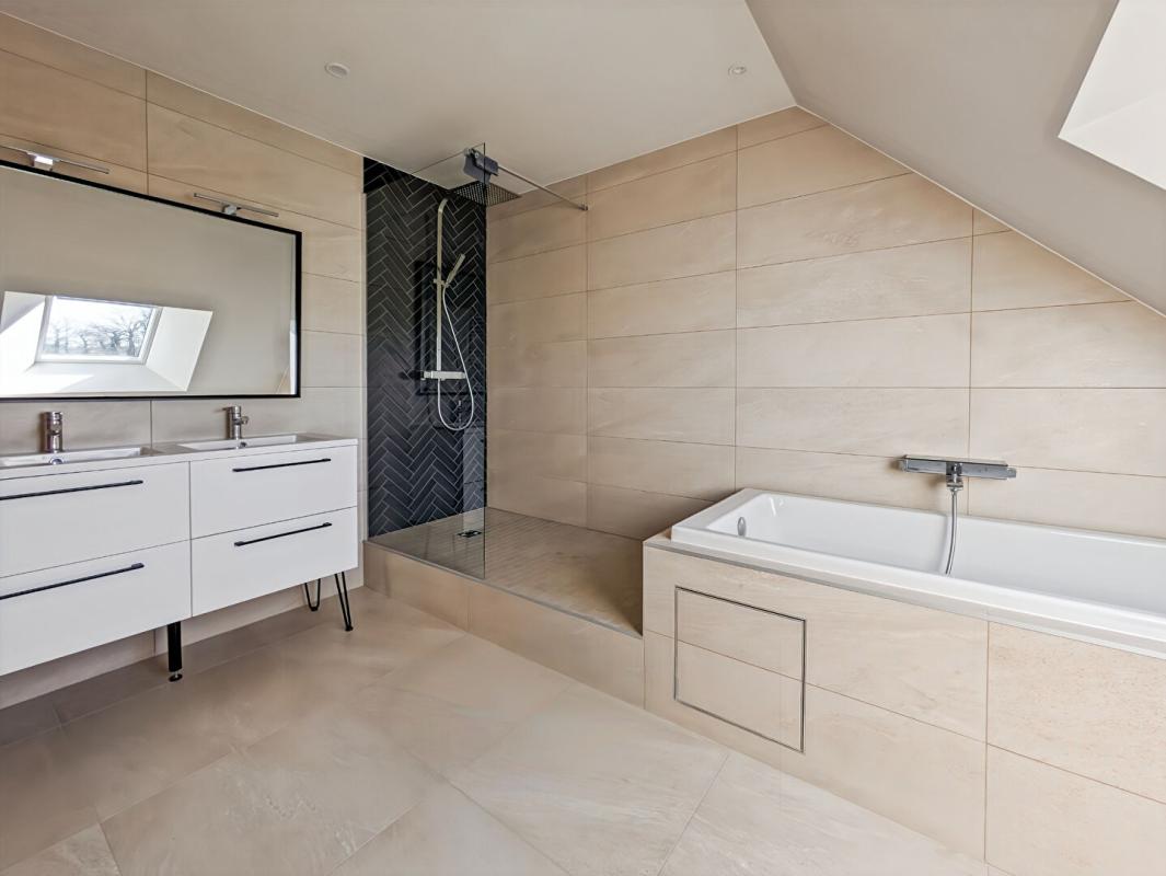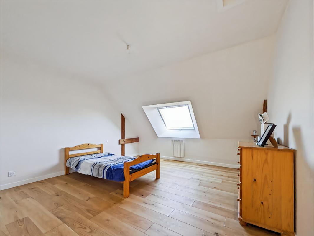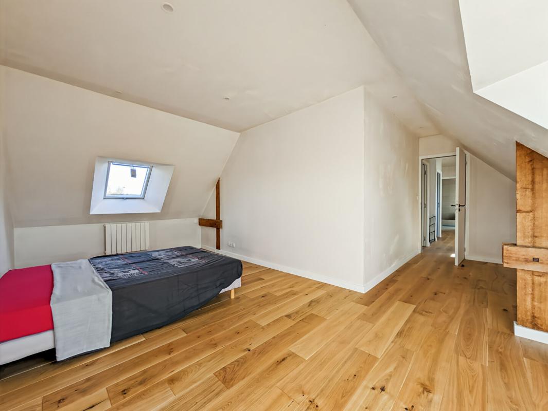 L’étage, accessible par un escalier moderne, dessert 3 grandes chambres et une salle de bains et douche avec wc.