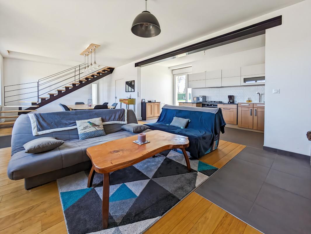 La pièce de vie d’une surface de 44m², sur parquet avec cheminée équipée d’un poêle à bois, et une cuisine aménagée et équipée, communique avec le jardin exposé sud.