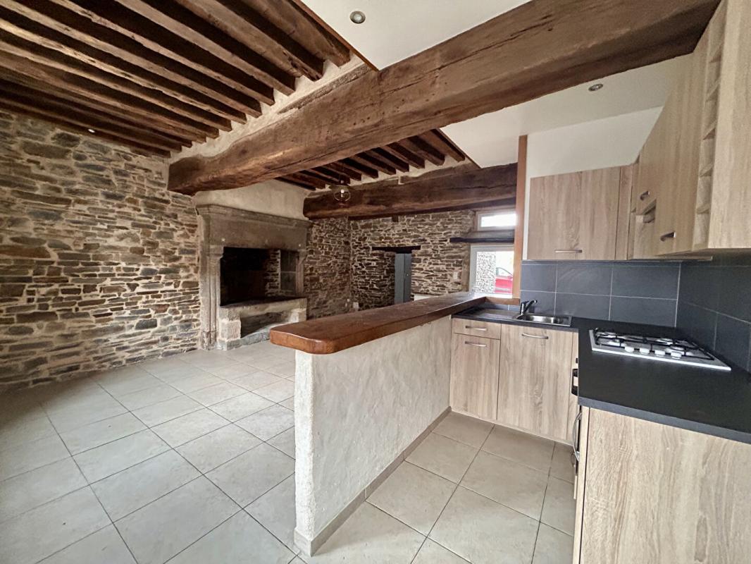 Au rez-de-chaussée : une pièce de vie avec poutres et pierres apparentes ouverte sur une cuisine aménagée et équipée (hotte, plaque de cuisson et four), des wc.