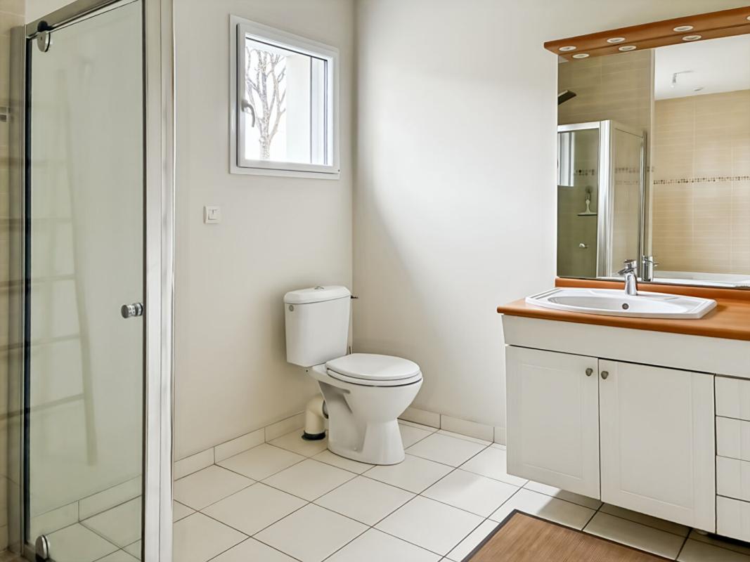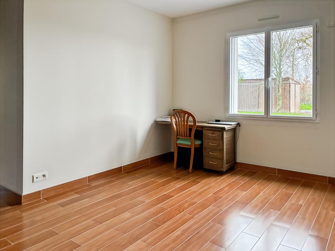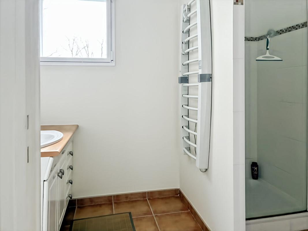 Toujours au rez-de-chaussée, une suite parentale offre un espace intime et confortable. Une seconde chambre, une salle de bains avec douche, baignoire et WC, ainsi qu’un WC indépendant complètent ce niveau.