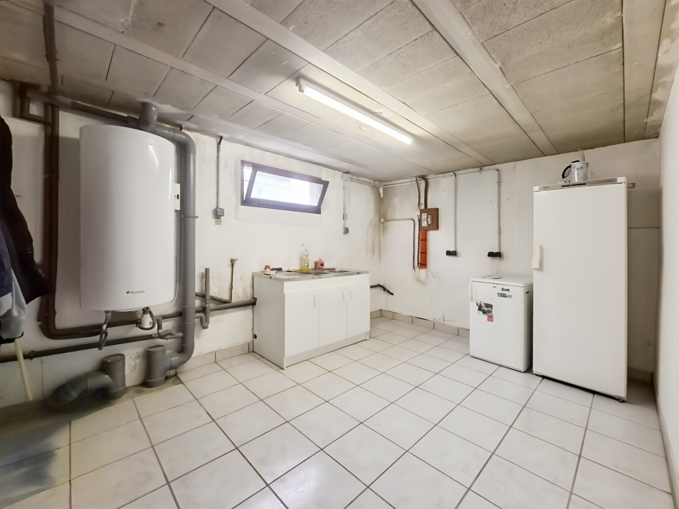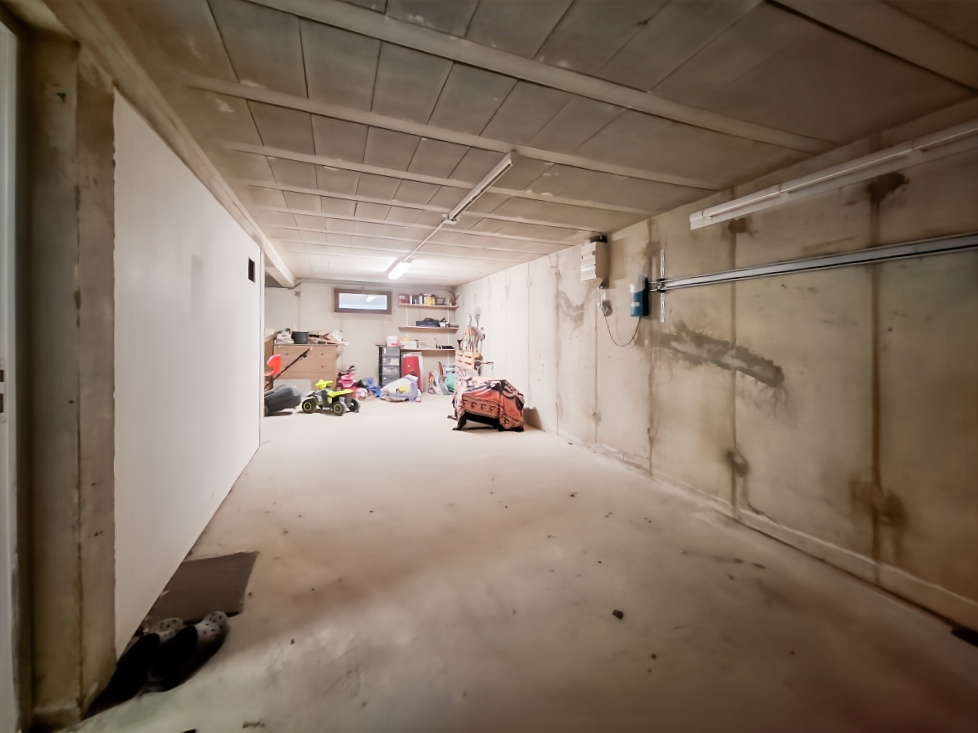 La maison dispose d’un sous-sol complet abritant une buanderie spacieuse de 11 m² pour le rangement et les appareils électroménagers, ainsi qu’un espace de stockage et un espace technique dédié au stockage des pellets. Un garage de 32 m² permet le stationnement d’un véhicule et offre un espace atelier ou rangement supplémentaire.