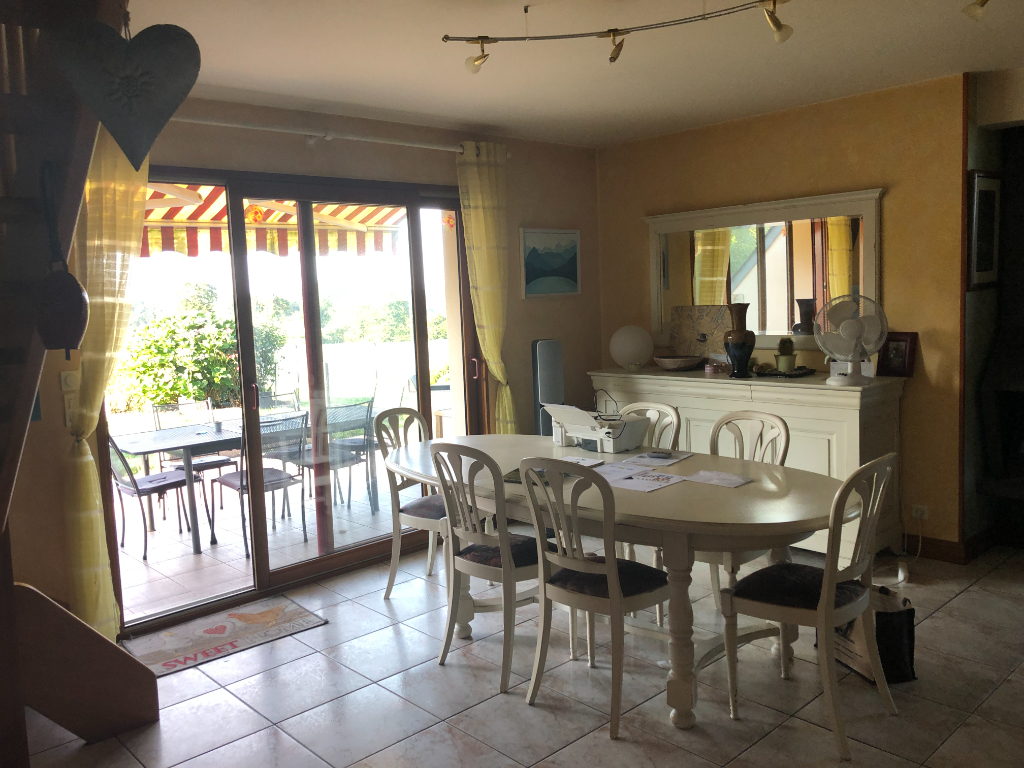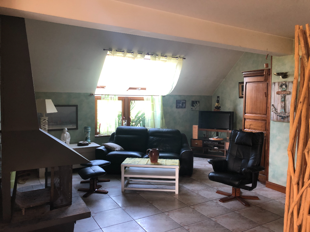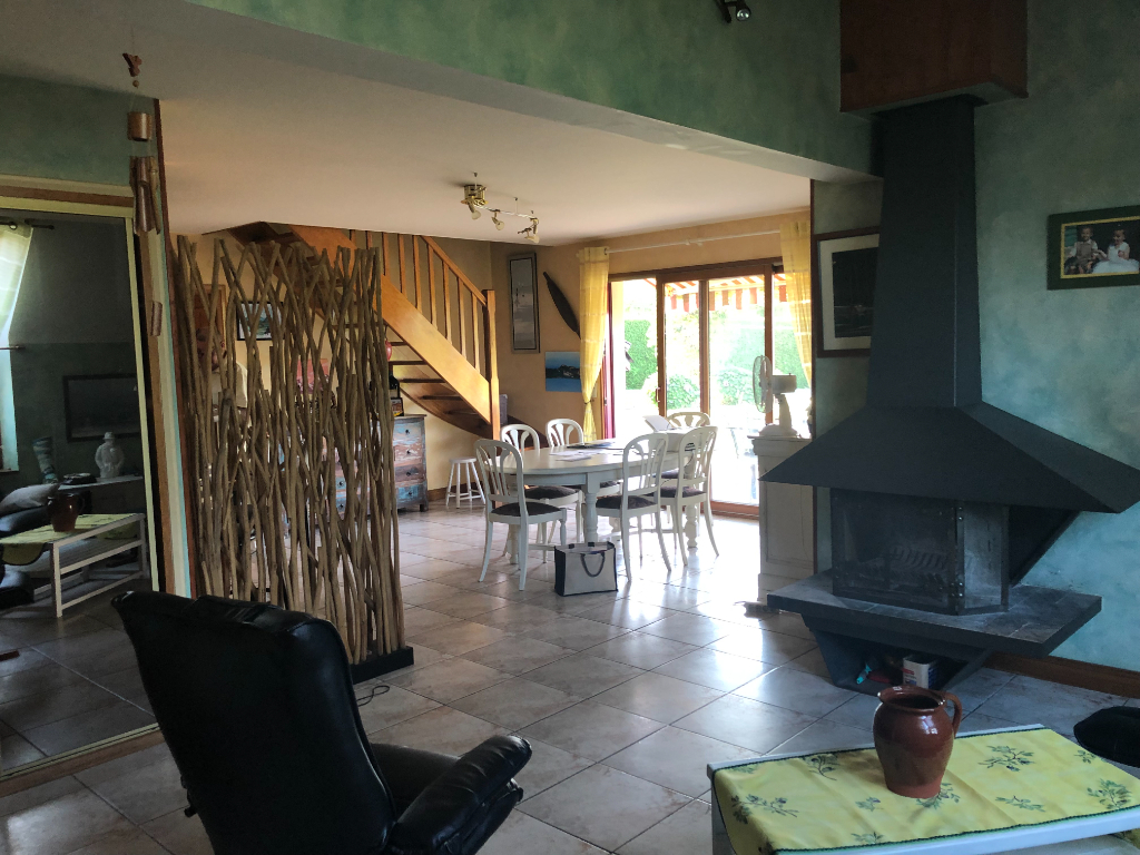 – au rez-de-chaussée : vaste pièce de vie très lumineuse avec cheminée à foyer ouvert et accès terrasse plein sud avec barbecue, cuisine aménagée et équipée donnant sur grande arrière-cuisine et accès direct au plus grand des 2 garages, couloir desservant deux chambres, grande salle de bains complète (double vasque, baignoire d’angle et douche) et WC.