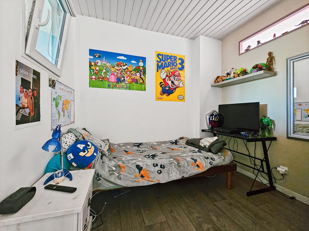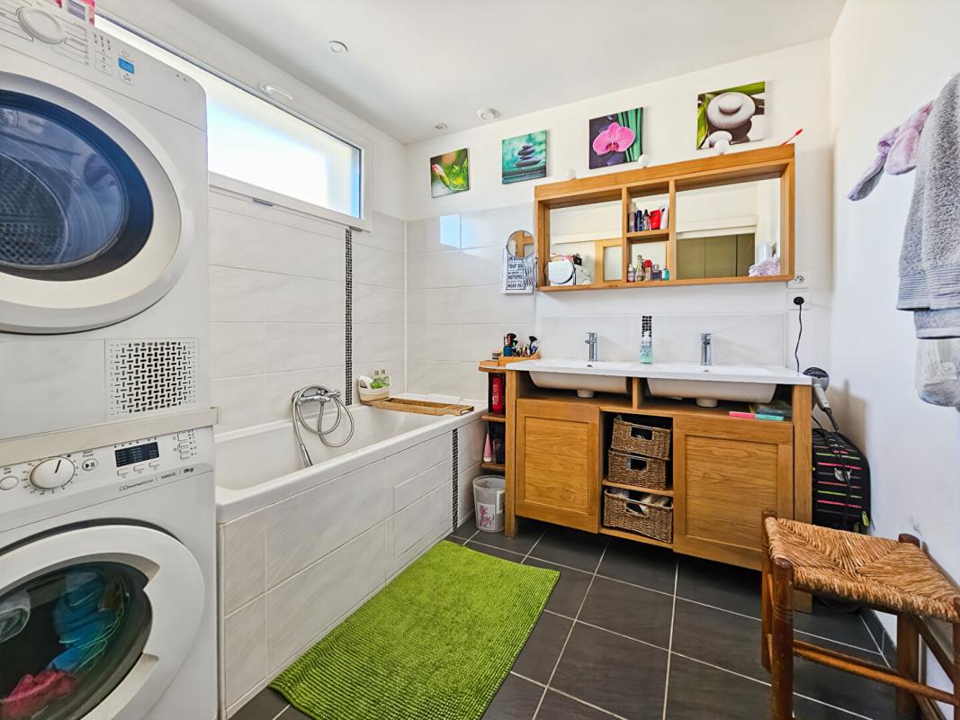 Cette maison comporte au rez-de-chaussée une très grande cuisine de 17m² aménagée et équipée, un séjour/salon lumineux avec une cheminée à foyer ouvert et un accès direct à la véranda. Vous trouverez également un WC indépendant, des placards, et une salle de bains.