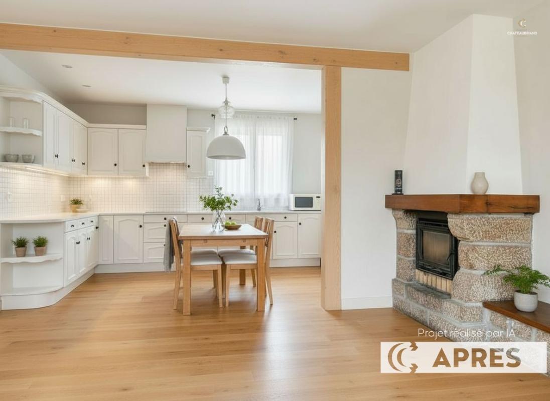 Dès l’entrée, vous serez séduit par une spacieuse cuisine avec espace repas de 29 m², agrémentée d’une cheminée avec insert, parfaite pour des moments conviviaux. Le salon lumineux de 23,27 m² complète agréablement l’espace de vie.