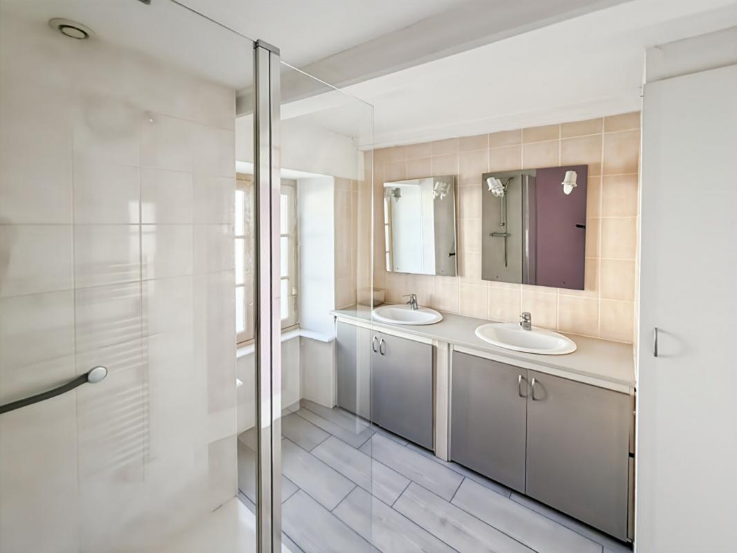 Le premier étage se compose de deux chambres spacieuses, d’une salle de bain rénovée avec double vasque et douche à l’italienne, et d’un second WC séparé.