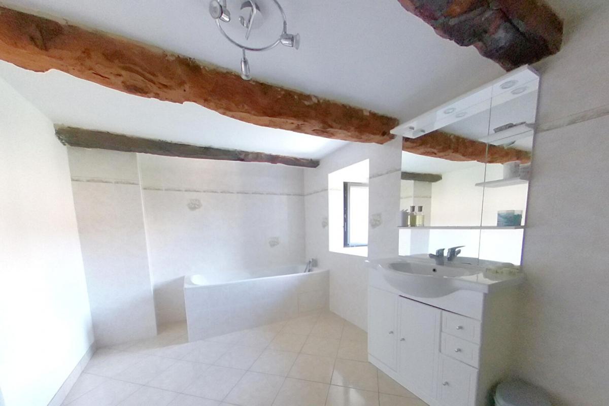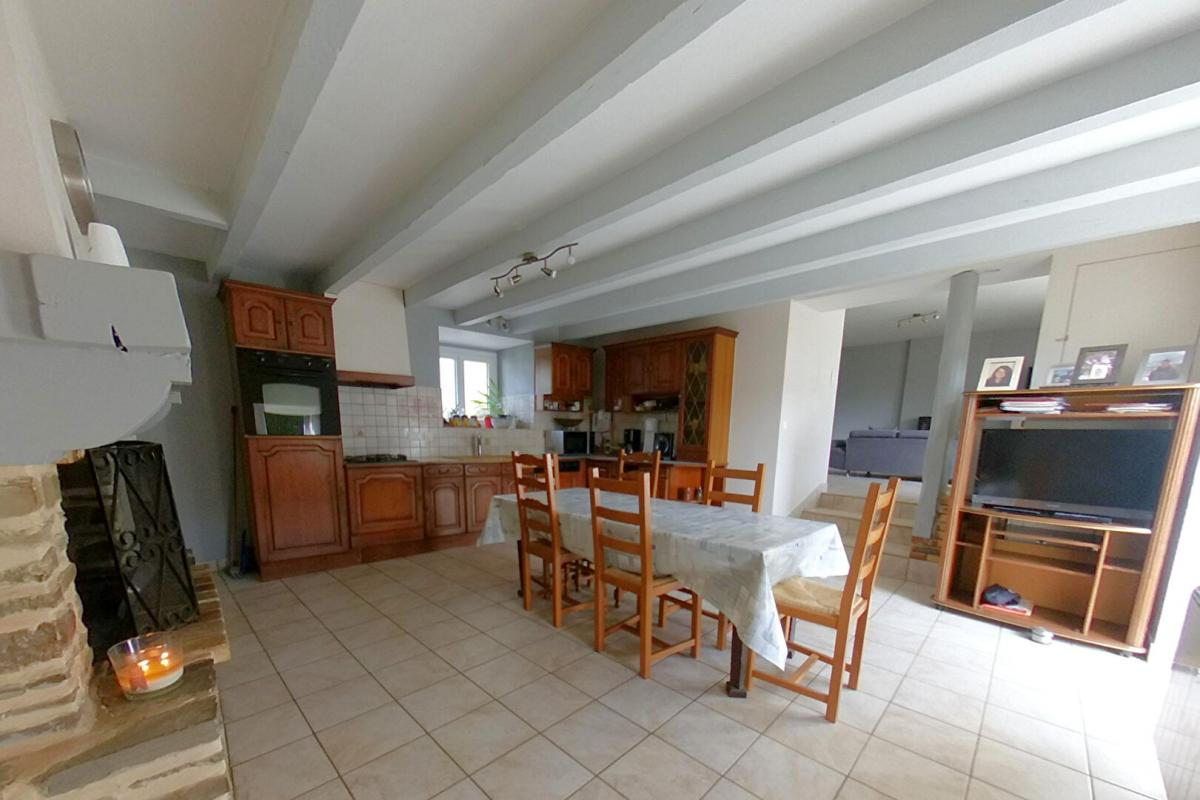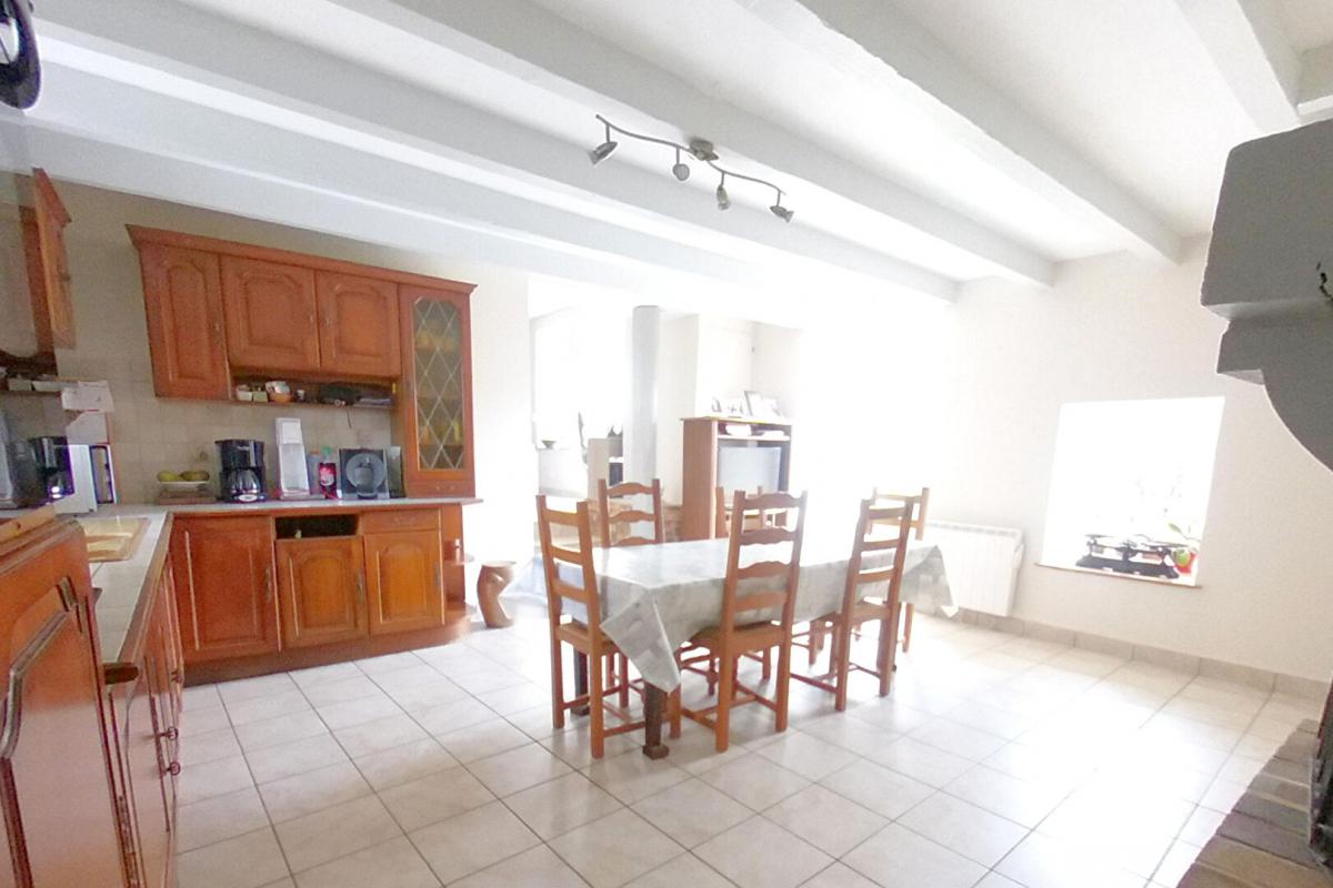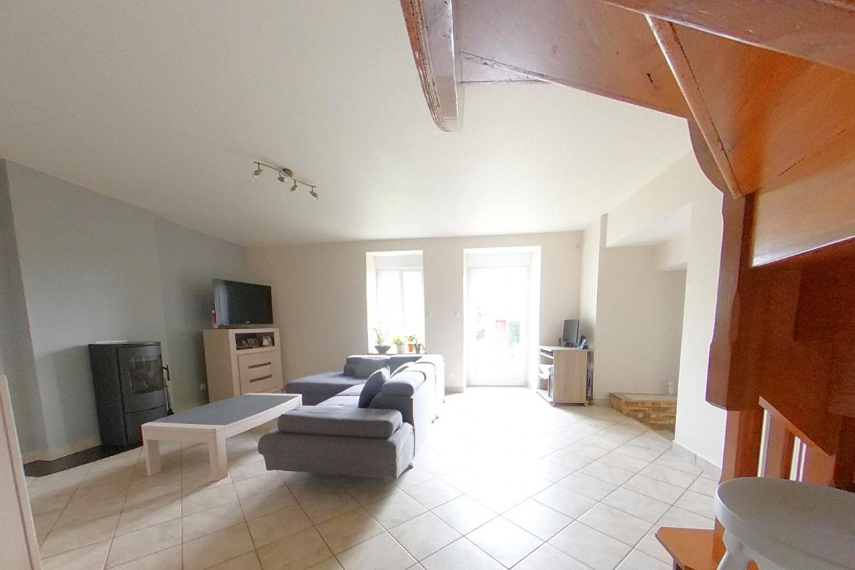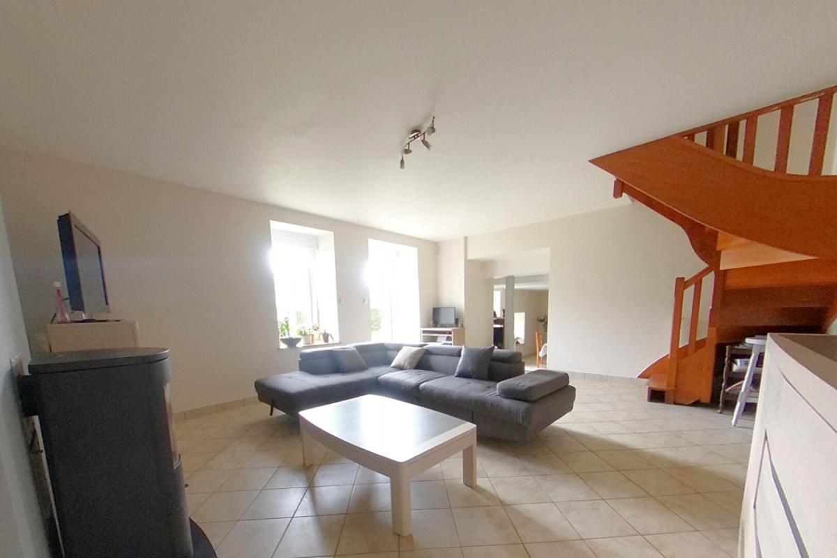 Belle maison en pierre pleine de charme d’une surface habitable de 121 m², comprenant au réez de chaussée une pièce de vie avec cuisine aménagée et une cheminée, un salon de 28 m² avec poêle à bois, une buanderie, salle d’eau et WC.