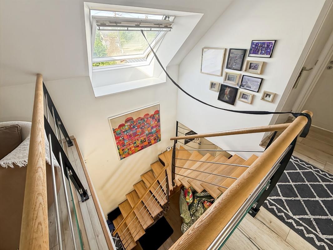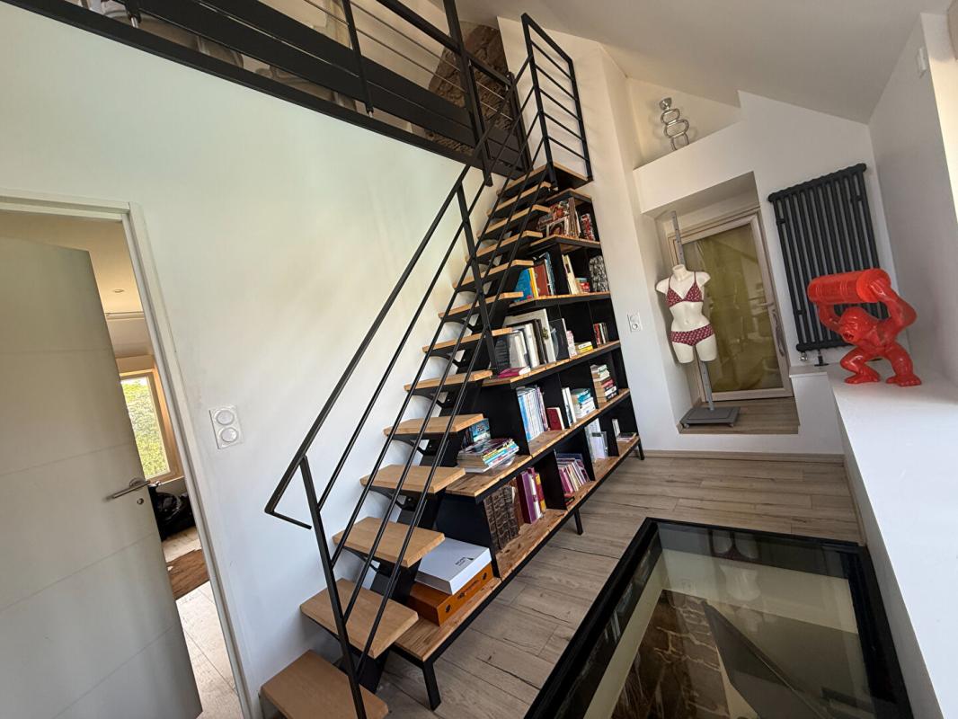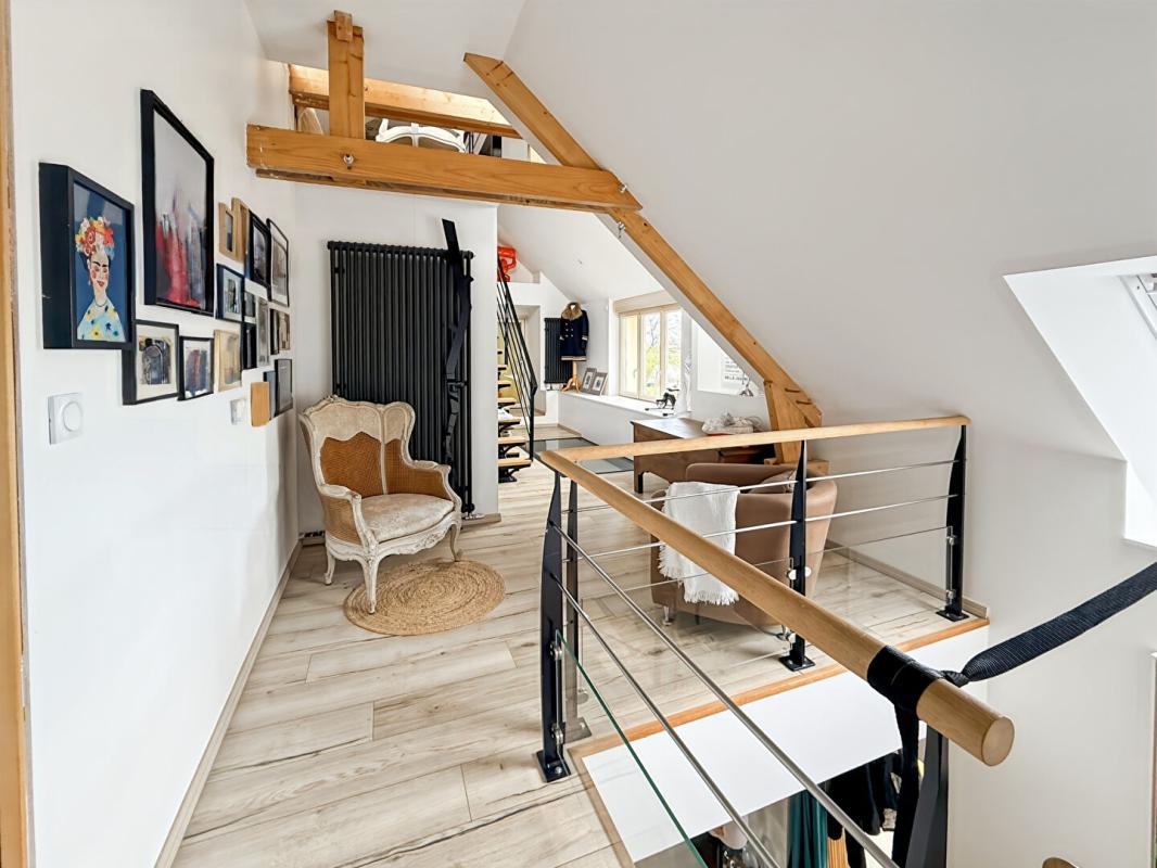 – à l’étage : palier avec dalle de sol vitrée desservant deux chambres avec chacune un accès à une salle de bains, bureau ou petite chambre, très grand espace de plus de 40 m2 à aménager (2 niveaux possibles), espace chambre ou coin détente en mezzanine.
