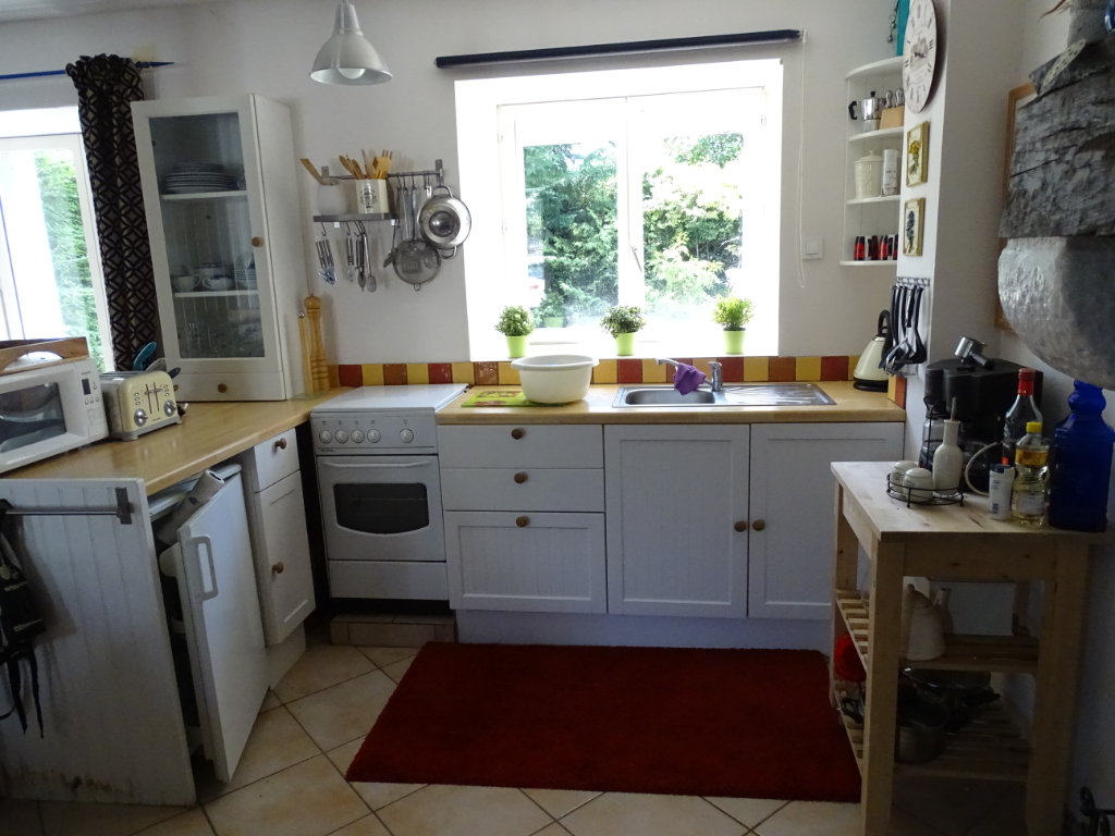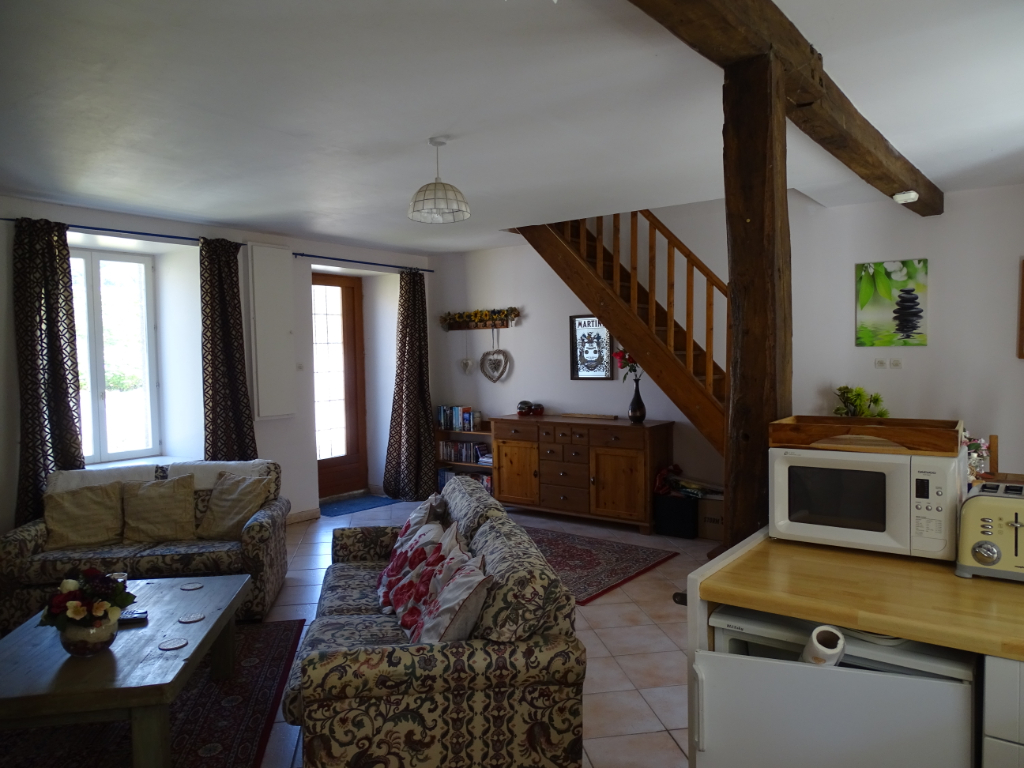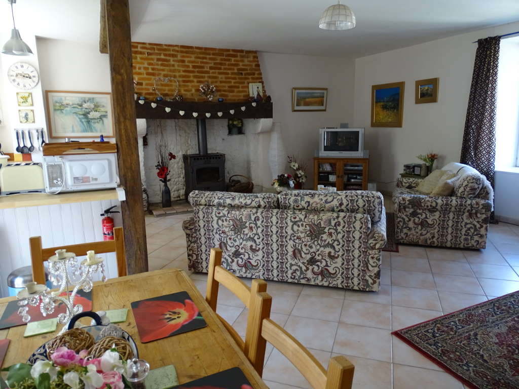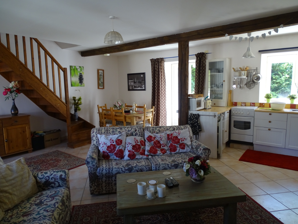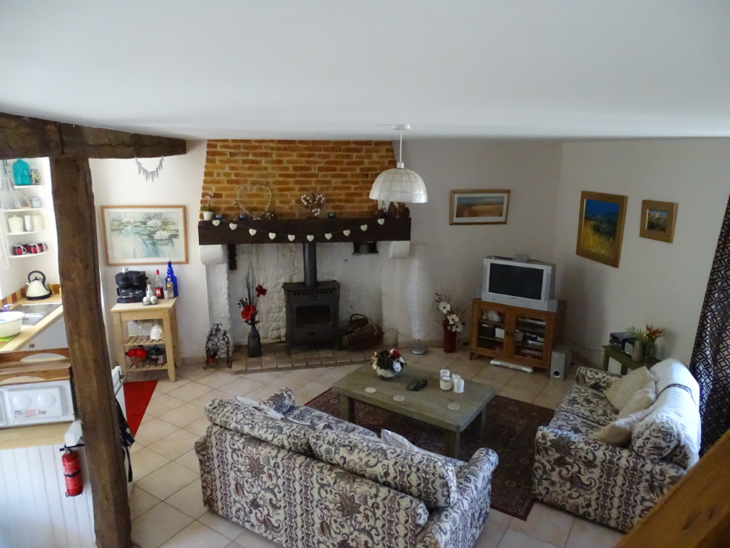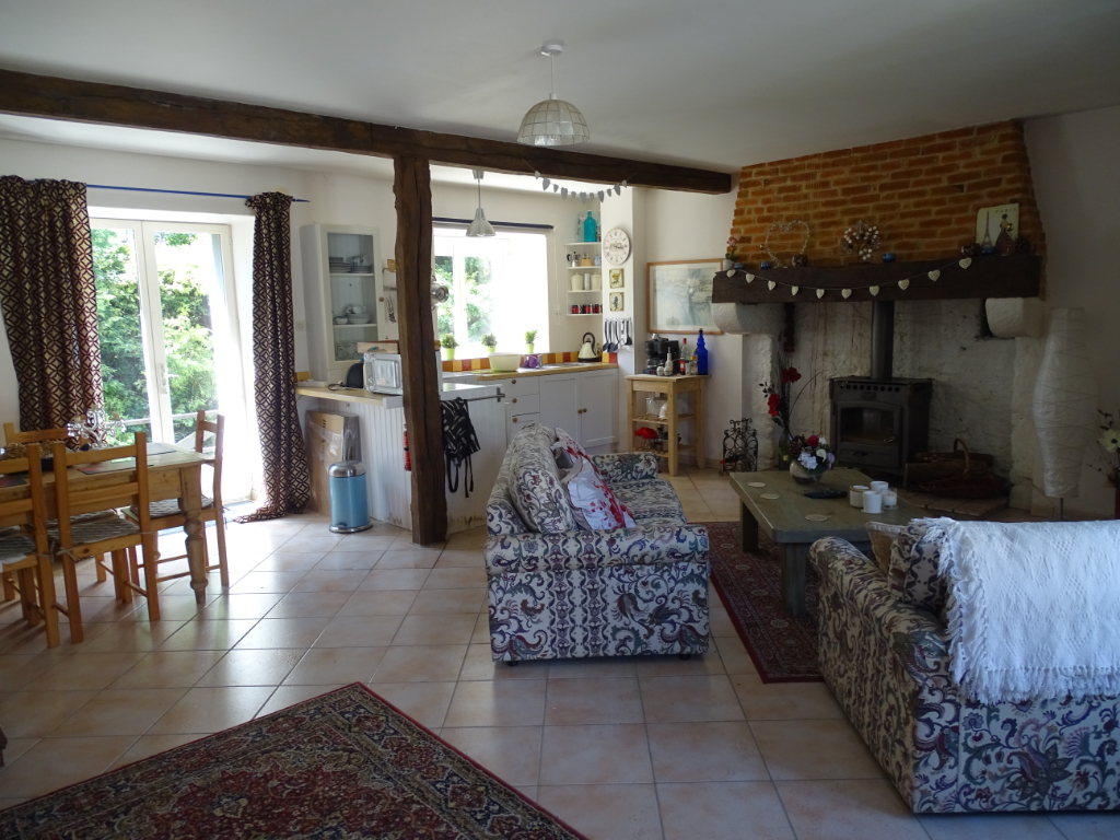 – au rez-de-chaussée : pièce de vie avec poêle à bois et coin cuisine aménagée donnant accès sur une terrasse exposée ouest et jardin de 500 m².