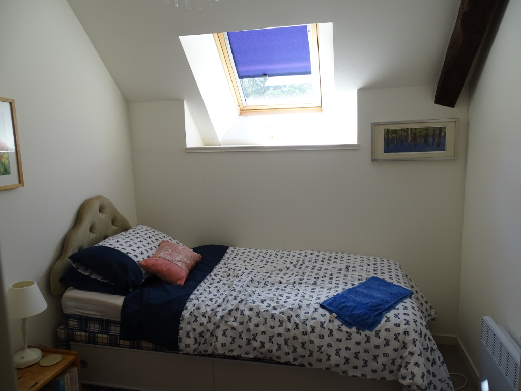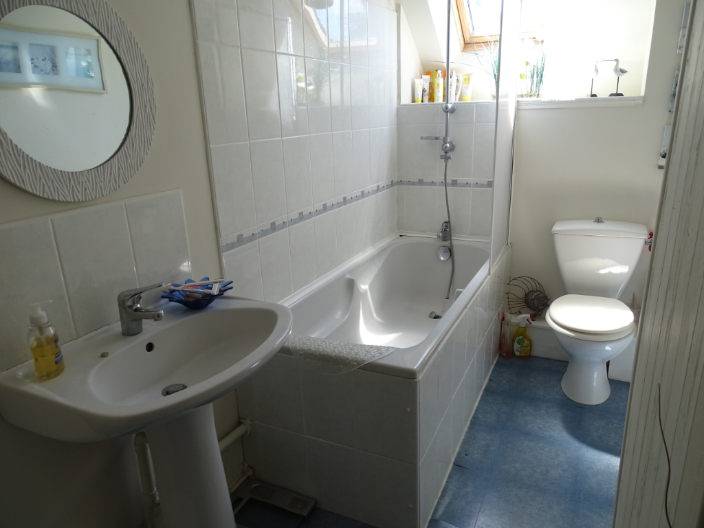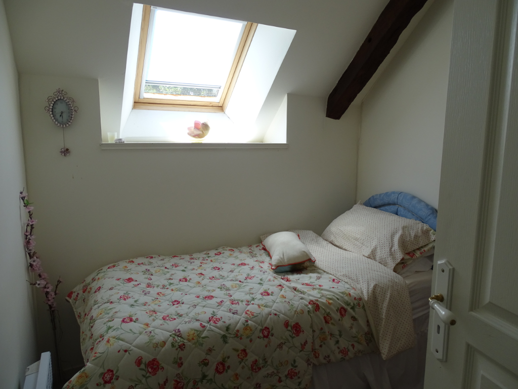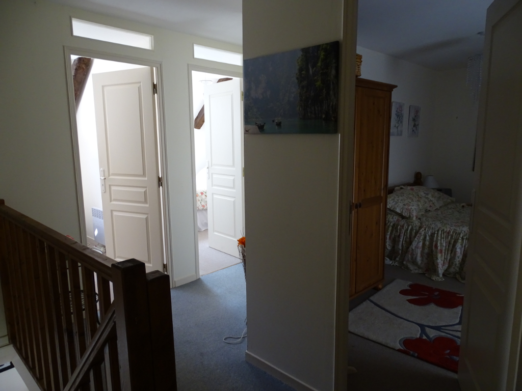 – à l’étage : palier desservant une chambre, deux petites pièces pouvant servir de bureau ou de chambre d’appoint, salle de bains avec WC.