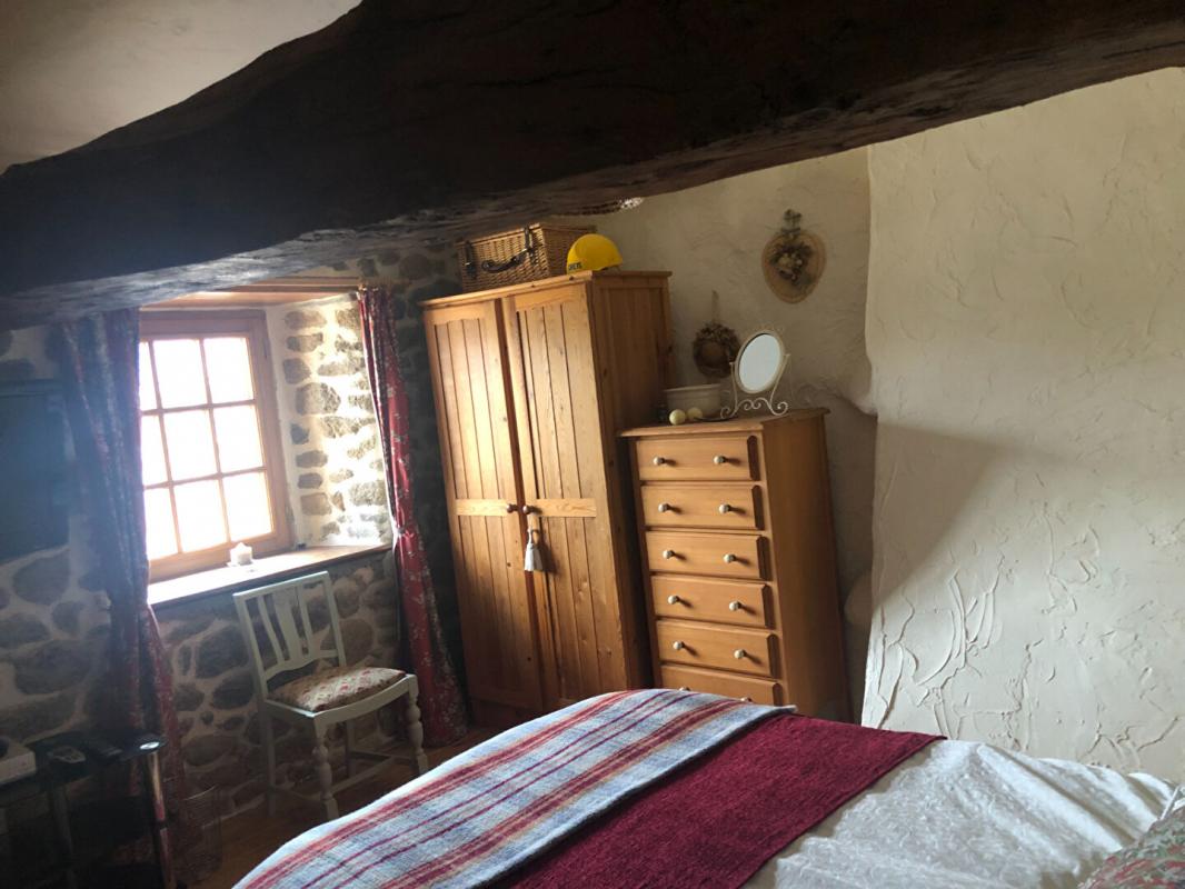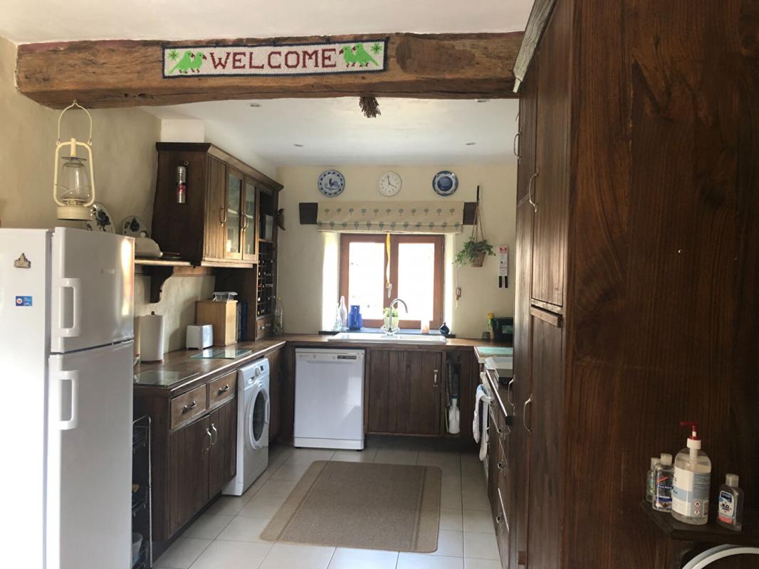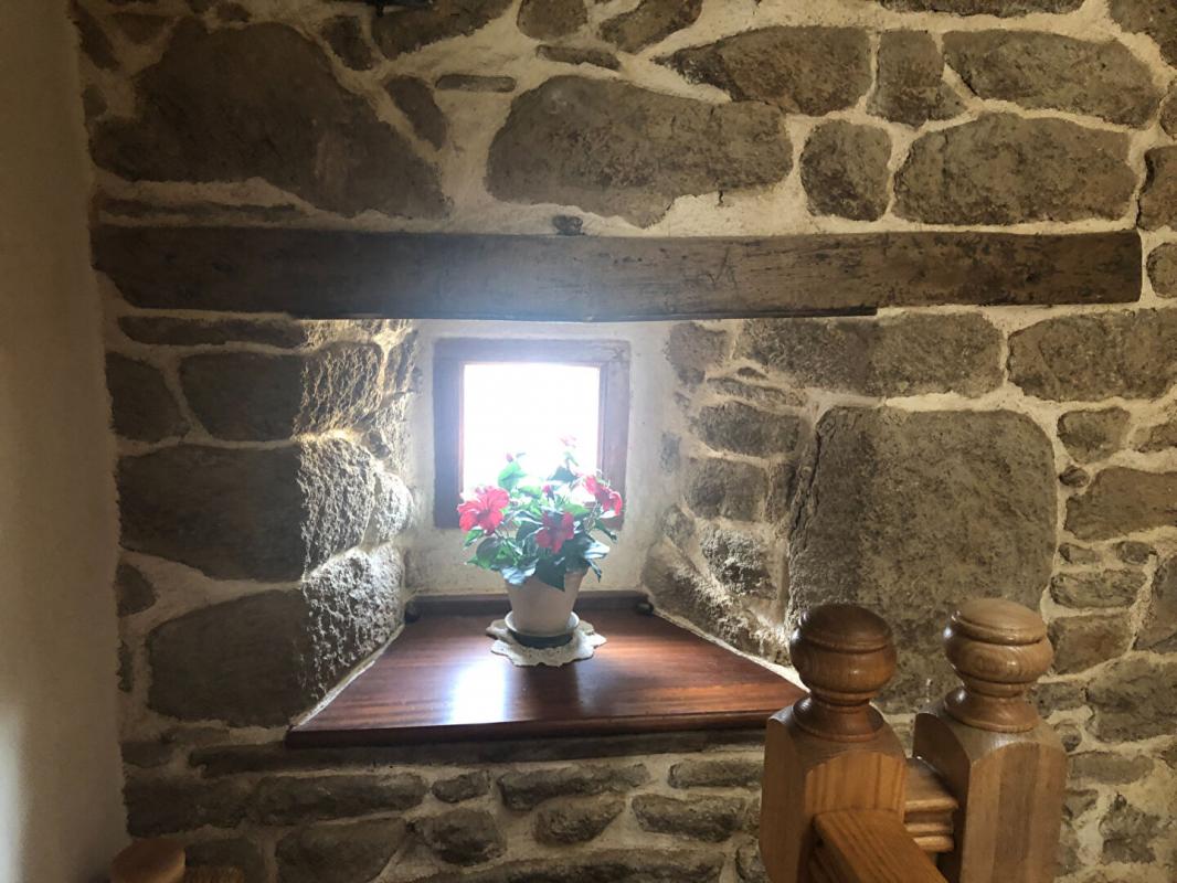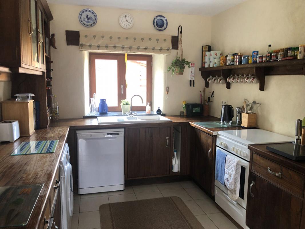 La maison comprend : une cuisine aménagée et équipée et une belle pièce de vie avec vaisselier en pierre et cheminée monumentale (poêle à bois) au RDC. Au premier étage : palier desservant deux chambres et une salle de bains. Au second étage : palier desservant une troisième chambre et une salle d’eau avec espace de rangement.