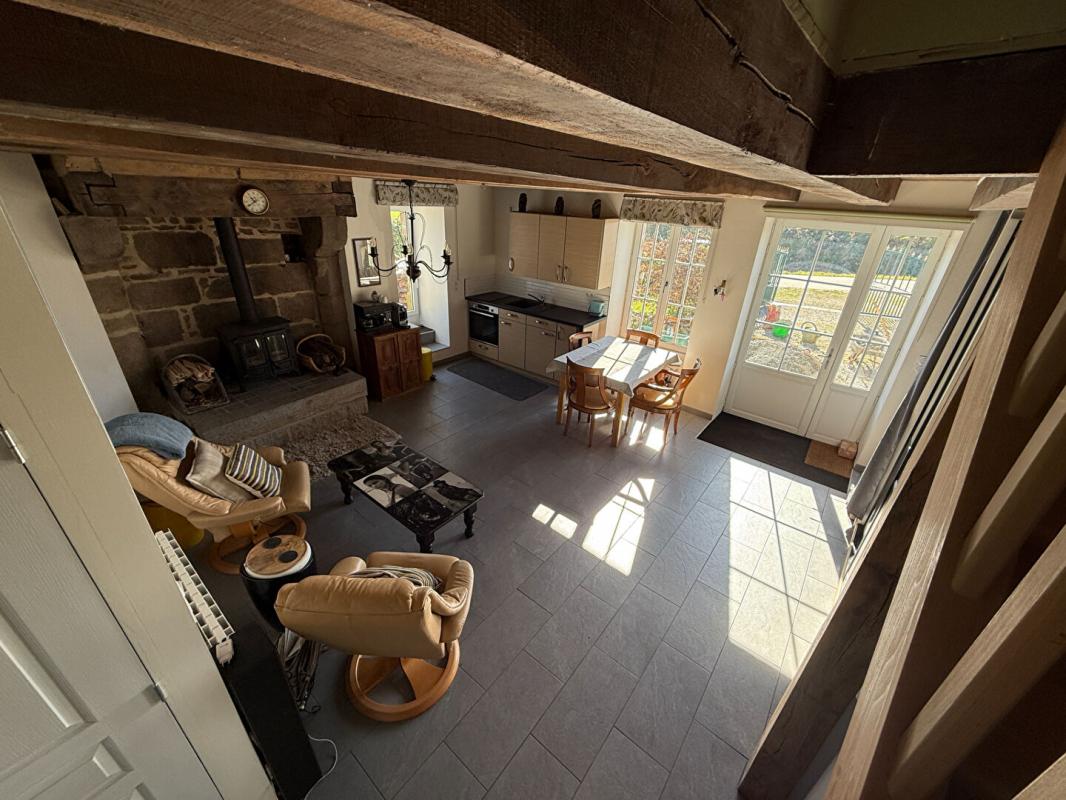 Vous entrerez dans la pièce de vie de 28,50 m² qui vous accueillera avec son POELE à bois pour plus de douceur et son coin cuisine aménagée et équipée. Le rez-de-chaussée comprend aussi une salle d’eau avec WC.