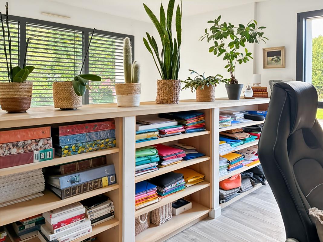 A l’étage : mezzanine avec bureau, trois chambres dotées de rangements intégrés, salle d’eau et WC indépendant.