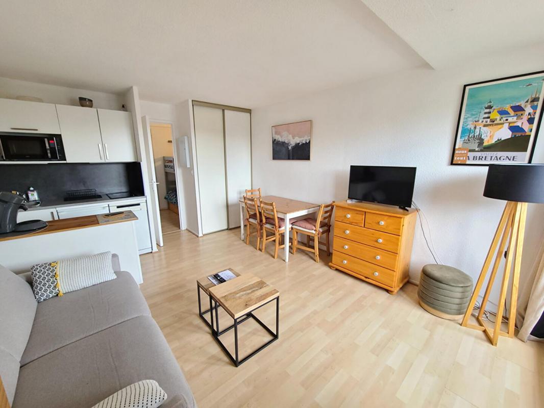 Appartement de 25.02 m2 loi Carrez, 26 m2 au sol, de type T1 BIS entièrement rénové et vendu meublé, située au Domaine de La Varde dans le quartier Rothéneuf, à 200 mètres à pieds de la mer, avec piscine et places de parking gratuites près de l’appartement, comprenant une pièce de vie, avec kitchenette aménagée et équipée, WC séparés, salle de bains, coin nuit. Balcon de 7 m2 privatif exposé plein sud ! Local à vélo.