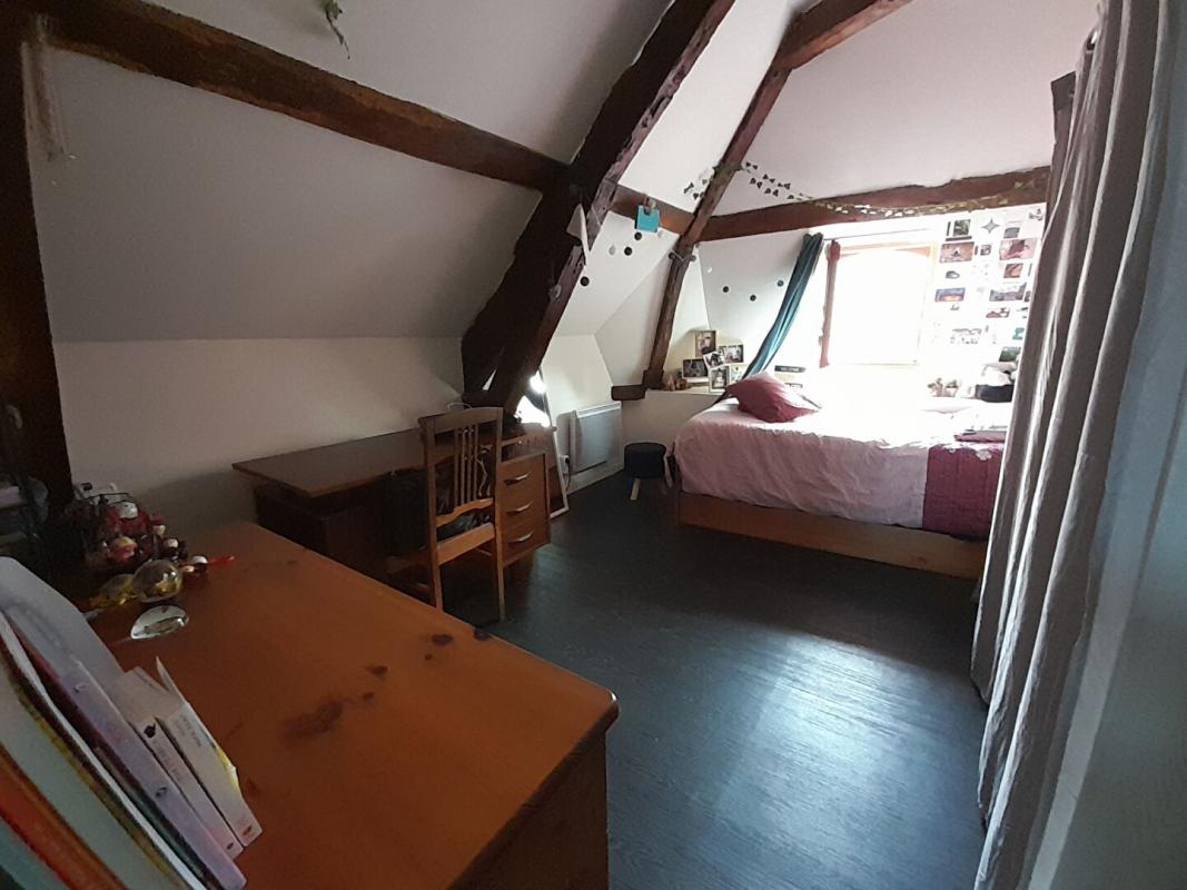A l’étage, un grand palier avec placards desservant deux chambres (sous mansarde et charpente apparente) et une salle de bain.